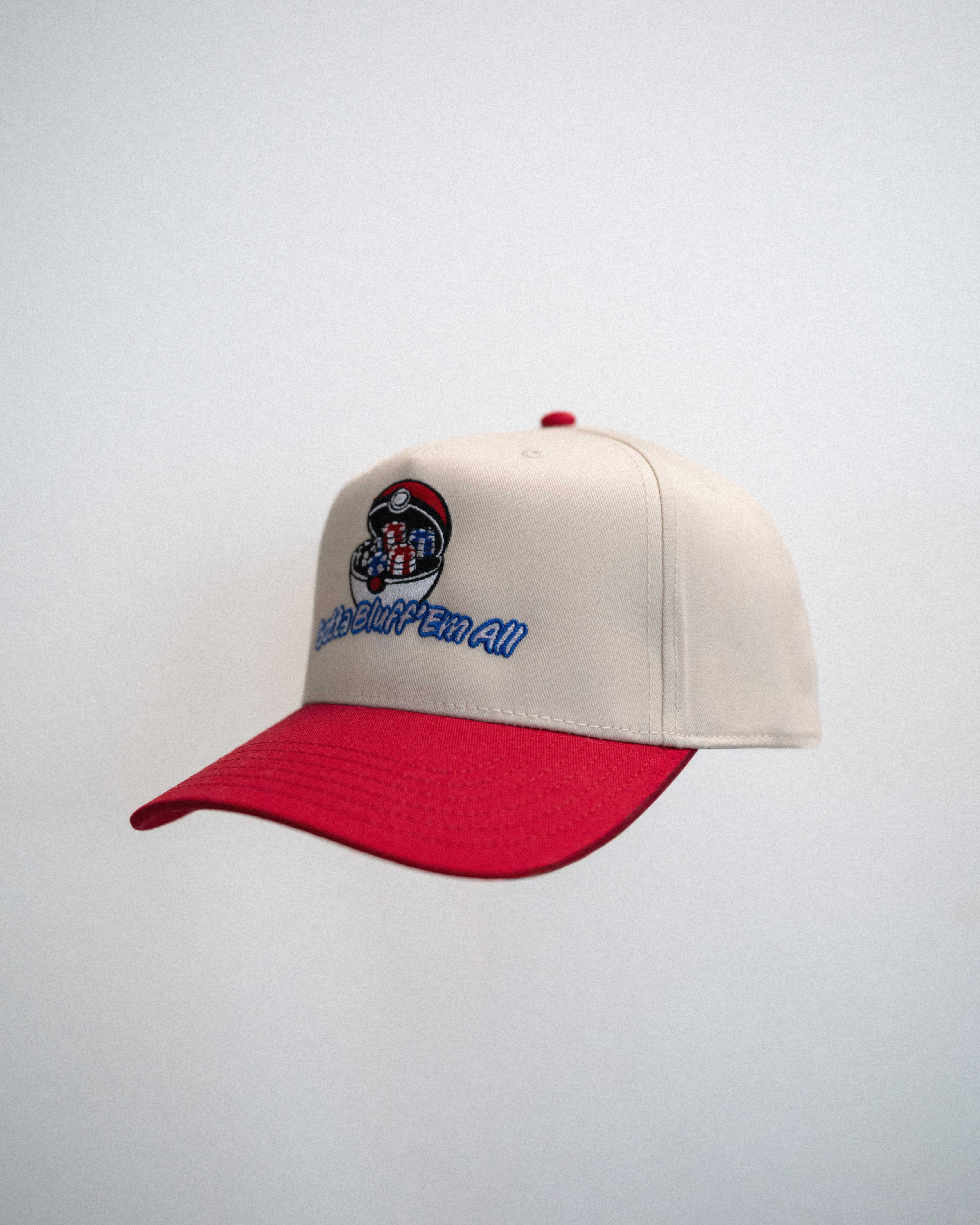 Bold, playful, and built for big hands and bigger personalities. This red-brimmed hat features clean embroidery of a ball bursting open with poker chips spilling out—a nod to high-stakes confidence and never showing your cards. Finished with the phrase “Gotta Bluff 'Em All”, it’s the perfect mix of card-room energy and pop-culture swagger. Wear it when you’re all in… or just pretending to be.